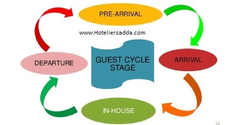 The guests have four main stages of interaction with the hotel-pre-arrival, arrival stay, and departure. All guests go through the same procedure as they proceed from reservation to arrival and allotment of rooms, till their stay in the hotel, to the settlement of their bills and departure from the hotel. These various stages of activities constitute the guest cycle.